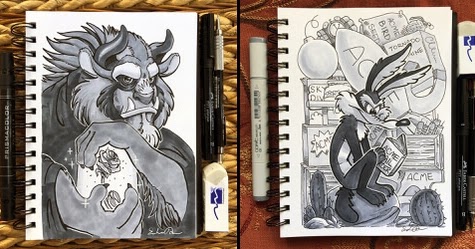 Dibujo de figuras de tinta tradicional en un cuaderno de bocetos.