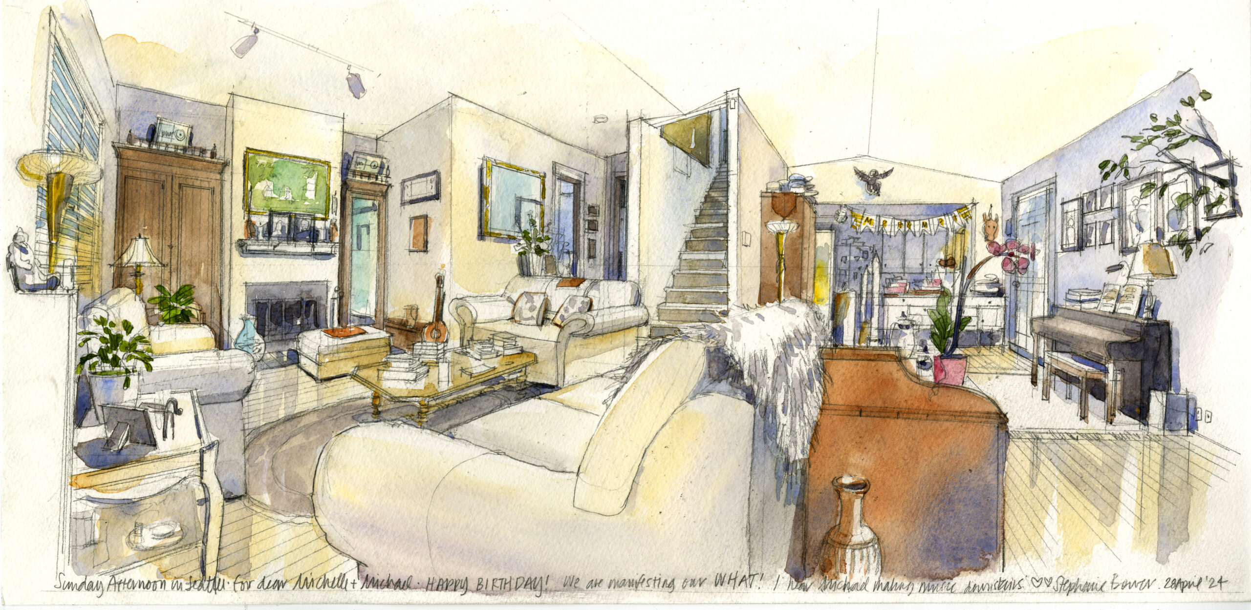 Disfruto dibujando diseños de interiores para los lugares donde viven mis amigos y familiares. Las cosas que nos rodean son muy importantes para nosotros, reflejan quiénes somos y me encanta plasmar esto en mis bocetos personales. A menudo doy estos bocetos como regalo como forma de agradecer… A menudo hago esto como agradecimiento a los amigos que ayudan a mi mamá.