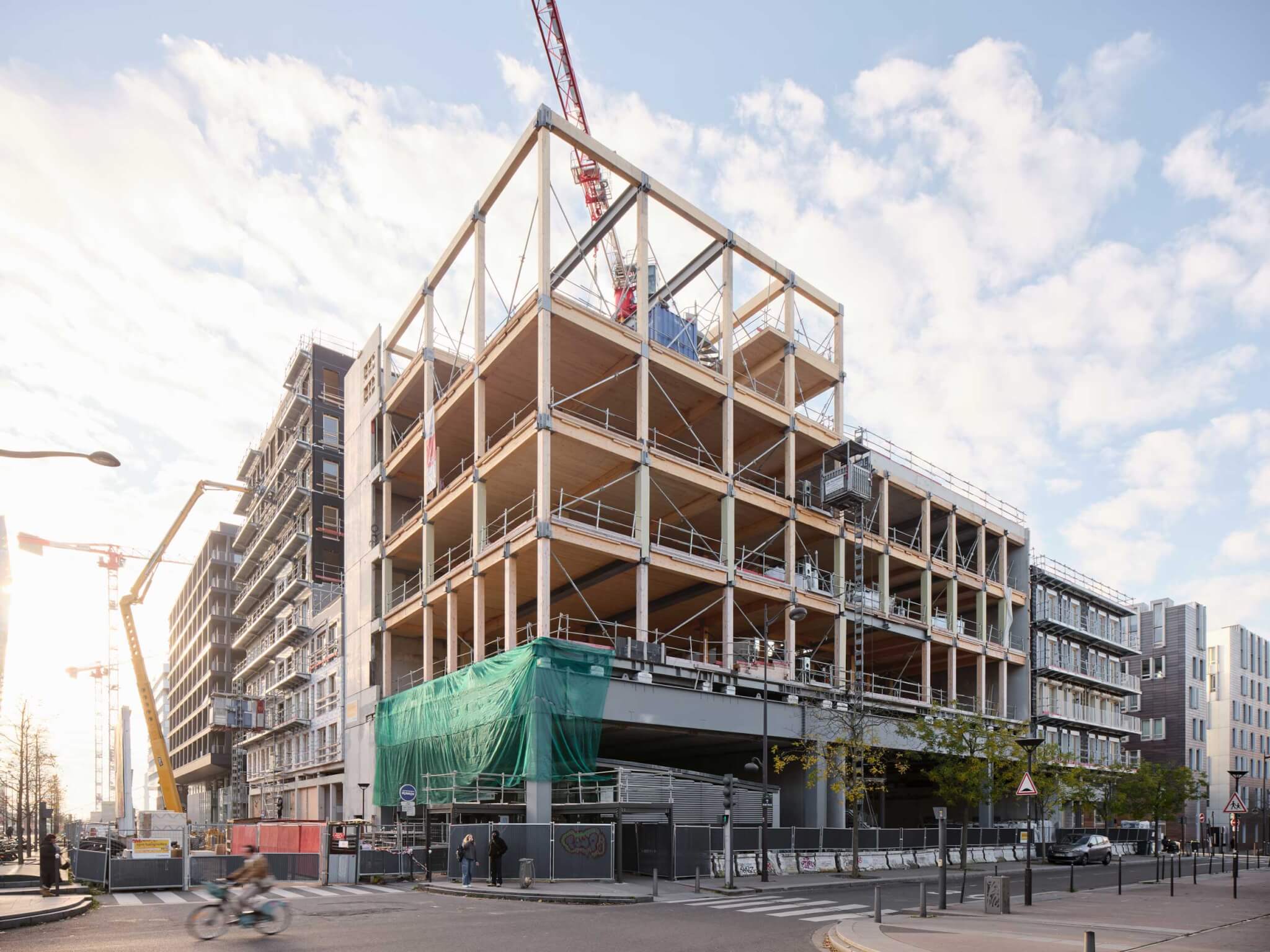 El Centro Boyer consta de 5 plantas madera contralaminada Columnas, vigas y paneles de madera laminada se asientan sobre un podio de acero y hormigón que alberga una concurrida estación de una línea de ferrocarril suburbano. Su funcionalidad no es nada inusual: combina aulas dedicadas y flexibles, salas de conferencias, salas de reuniones informales, espacios de estudio y oficinas (sin mencionar un último piso digno de una fotografía, adecuado para eventos públicos, conferencias y brindis con champán). También tiene una apariencia menos tradicional que algunas de las formas más salvajes que han tomado forma aquí, incluidos los apartamentos Émerod en forma de cinta de Rudy Ricciotti, las residencias inclinadas de Hamonic+Masson y Comte & Vollenweider, y el M9-C con paneles de aluminio de BP Architects. Lo que es único en este proyecto, sin embargo, es el esfuerzo de Studio Gang por hacer que un único edificio urbano parezca un campus espacioso en lo que probablemente sea uno de los sitios más estrechos de todo el esquema de la Margen Izquierda de París.