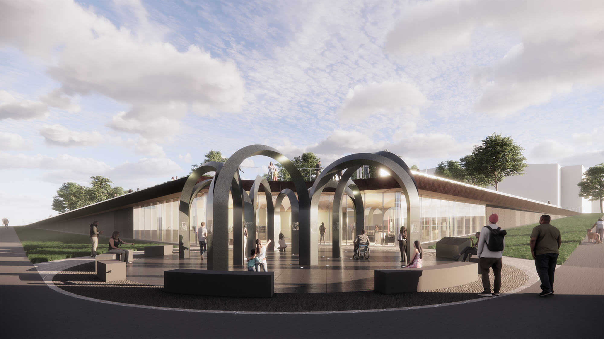 Cada columna está acabada en piedra y tiene su propia curvatura y altura únicas. Cada uno estará grabado con los nombres de las víctimas y los sobrevivientes. Los pilares interconectados están unidos alrededor de un edificio de apoyo que albergará programación educativa, exhibiciones, eventos comunitarios, reuniones y eventos. También habrá un paseo conmemorativo elevado en el techo del edificio de soporte que también funcionará como espacio de parque y punto de reflexión.