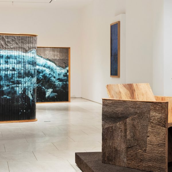 Muebles revestidos de corteza en una exposición de obras de Noé Duchaufour-Lawrance