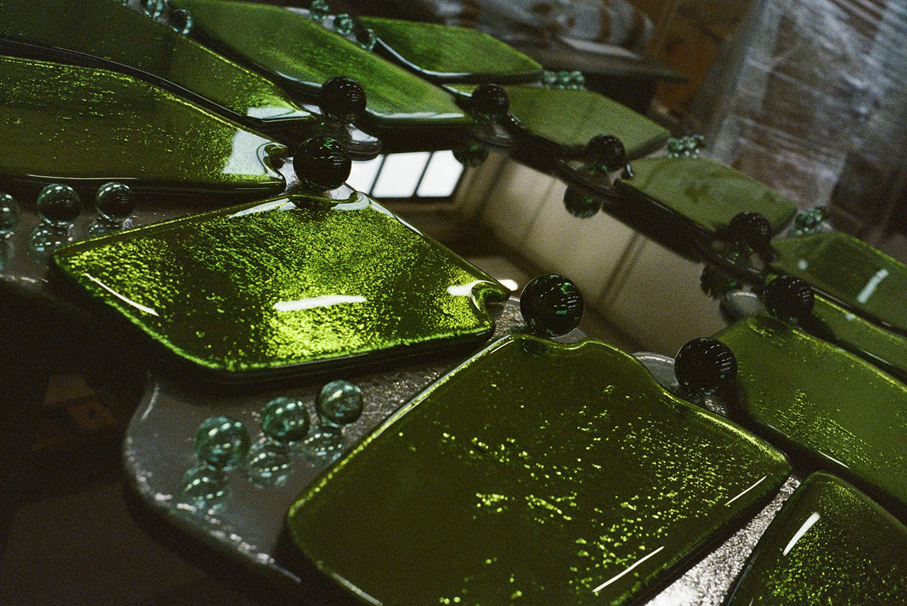 El deslumbrante vidrio plateado y el brillante aluminio mate son los principales componentes de la paleta detrás de la estética etérea. Los bancos y sillas de metal se producen en París y presentan elementos de formas extruidas y celosías. El primero tiene paneles circulares de vidrio fijados a los asientos, mientras que el segundo tiene una silueta vagamente catedralicia. Fabricada en Manhattan, la lámpara se inspira en sus hermanas y toma prestadas formas geométricas para crear pequeños apliques ovalados sostenidos por nodos. Pero el más fascinante del grupo, y la columna vertebral de la colección, es el espejo fabricado en Venecia, Italia. vitralia, un fabricante de vidrio reconocido por su experiencia. Los elementos hacen referencia a los nenúfares en color y forma y están ingeniosamente dispuestos con esferas de cristal de Murano pintadas a mano en el centro.