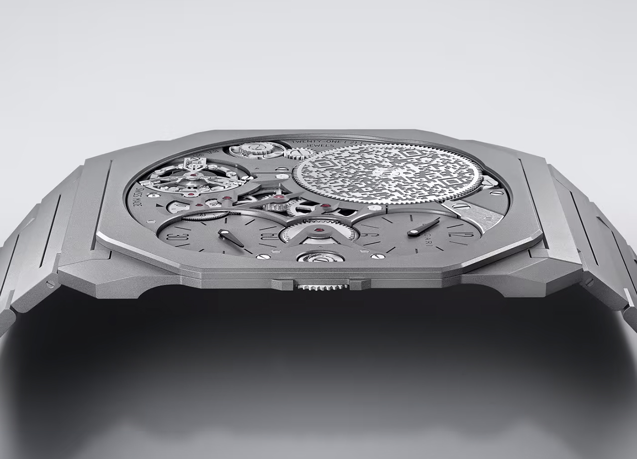 Al igual que el diseño de un microchip, el nuevo Bulgari Octo Finissimo Ultra COSC requirió que sus diseñadores encontraran formas novedosas de llevar la relojería mecánica al límite. Teniendo en cuenta que los componentes del reloj, como la esfera, el cilindro y el bisel, normalmente tienen su propia jerarquía única en la arquitectura del reloj, en la caja (parte posterior) del Octo Finissimo Ultra COSC de 40 mm, la suma de 170 componentes es responsable de generar las 50 horas del reloj. La reserva de marcha se reorganiza en un plano horizontal en la parte posterior del reloj.