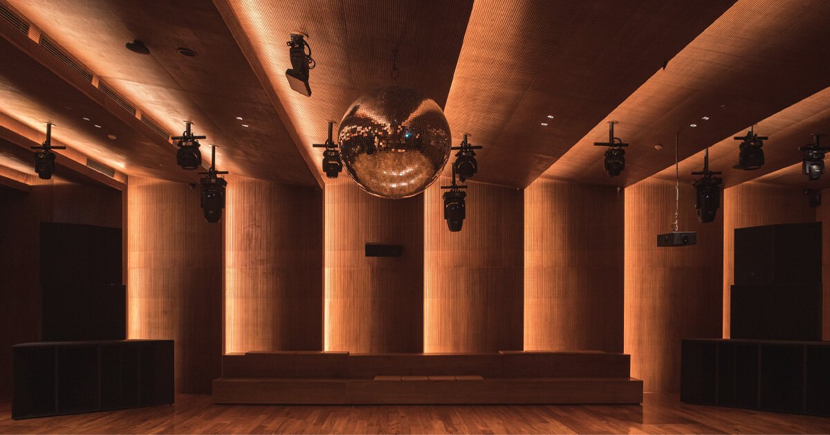 La pista de baile de primavera de 208 metros cuadrados está diseñada para reducir la fatiga y la presión sobre las articulaciones de los bailarines. Por este motivo, los salones de baile tradicionalmente han tenido suelos de muelles. En los tiempos modernos, esta práctica se ha perdido un poco. La tecnología es similar a la utilizada en las canchas de baloncesto: se construyen cuatro capas de celosía de madera en una estructura con espuma de 50 mm de espesor entre cada intersección. Una bola de discoteca con un diámetro de 1 m está suspendida sobre la pista de baile. La cabina de DJ flotante totalmente aislada garantiza que los sonidos de la pista de baile no penetren en la cabina. Los parlantes del monitor tienen los mismos controladores que la pila de parlantes de la sala principal.