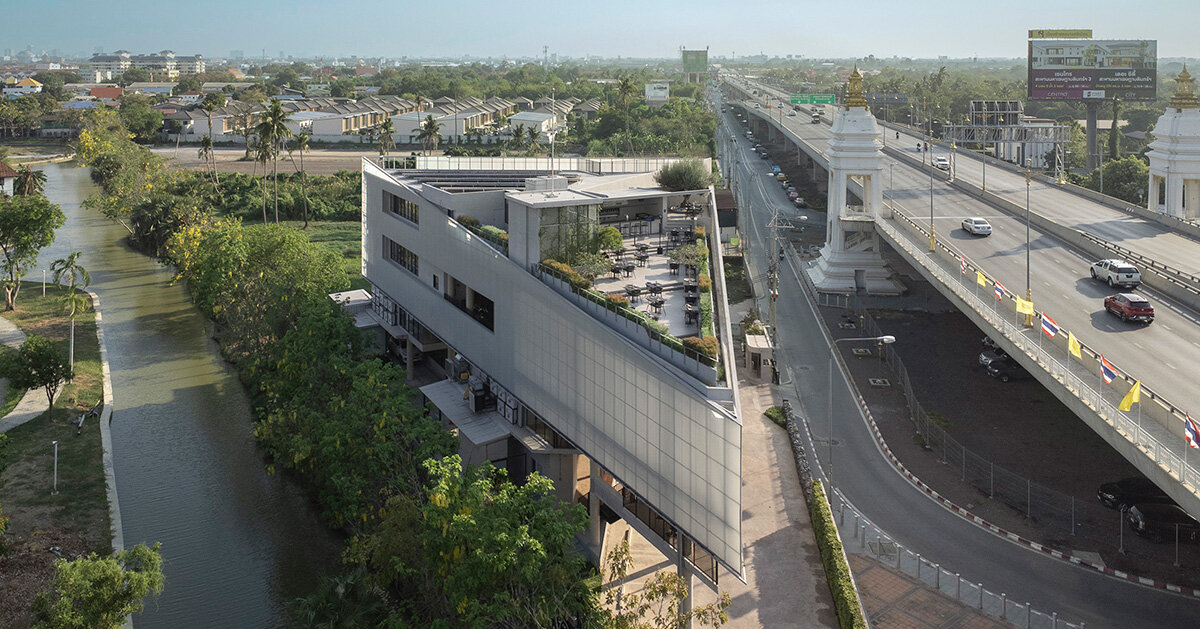 ASWA (Estudio de Arquitectura – Aholic) completó Craft Estate en Nonthaburi, Tailandiaun edificio triangular multifuncional que alberga oficina Espacio y sala de estar compartida con vista al río que sirve cervezas artesanales. barcafés y Comedor. Ubicado entre el puente que cruza el río y las áreas públicas. jardín, el proyecto enfatiza la singularidad de su sitio triangular y lo traduce a un lenguaje arquitectónico. El edificio tiene una superficie de 1.400 metros cuadrados y está visualmente dominado por arquitecto Se divide en dos partes para seguir las dos funciones principales del plan: restaurante y espacio de oficinas. Esta división también se refleja en los dos materiales principales utilizados en el exterior, con fibra de vidrio blanca translúcida y hormigón prefabricado elegidos para el corte conceptual del edificio. La fachada está revestida con tejas blancas translúcidas de fibra de vidrio, lo que permite que la luz solar natural difusa entre al edificio y al mismo tiempo garantiza la privacidad interior a través de su efecto de oscurecimiento.