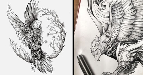 Dibujos de animales en tinta de estilo intrincado.
