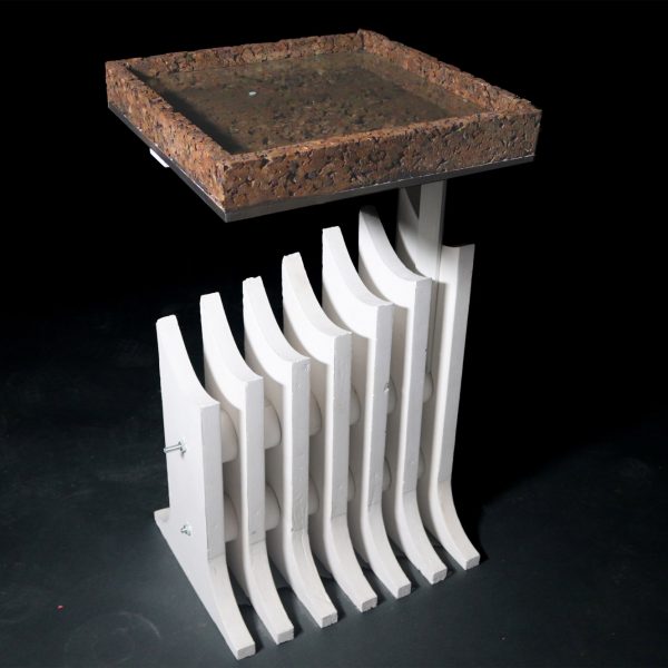 «La pieza está hecha de anhidrita, corcho, vidrio y acero curvado, combinando materiales reciclados con un diseño original».