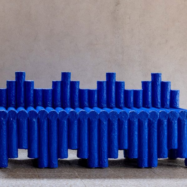 Entre los expositores se encuentran varios diseñadores locales como Hannah Biglesonexpuso diversas piezas, como un banco revestido de yeso cemento y pintado de azul oscuro, tanto en la zona del garaje cubierto como en el interior.