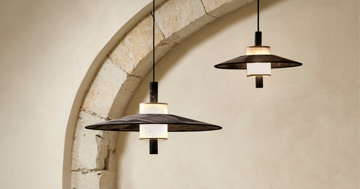 Cada pieza de la colección, ya sea colgante, de mesa o de pie, difunde suavemente la luz ambiental y combina materiales como el mármol negro y el lino.