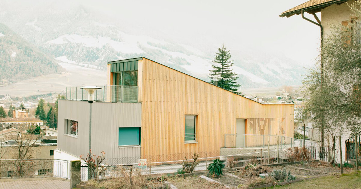 familia RVTK Residencial El edificio diseñado por Messner Architects se encuentra encima de Silandro. Italia, situado en la vertiente sur de la montaña Val Venosta Montesole. La zona cuenta con viviendas unifamiliares y plurifamiliares con jardines y viñedos. Al otro lado del valle se eleva el monte La Montaña, con sus prados y bosques, y la llanura del valle se extiende de este a oeste, inclinada hacia el paso de Resia.