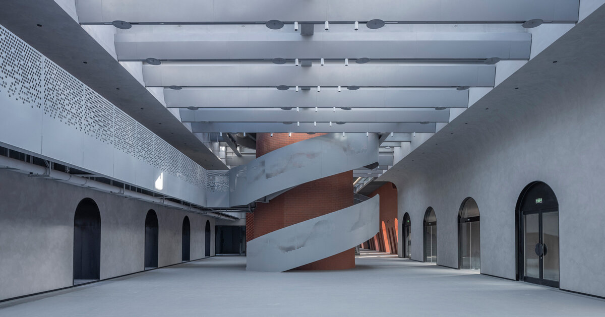 Los pasillos a ambos lados del edificio cuentan con arcos continuos, creando patrones de luz rítmicos. Los tragaluces en las paredes del pasillo aportan mucha luz y sirven como salidas de humos. Un puente de acero en voladizo conecta varios espacios funcionales, integrando las paredes curvas del edificio en el diseño espacial.