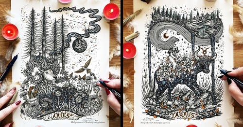 Sus obras están siempre llenas de escenas fascinantes y maravillosas. Estos no son diferentes y todos están relacionados con los signos del zodíaco.