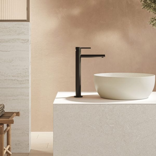 Disponible en cinco formas redondas (guijarro, cuadrado, redondo, TV y ovalado), todas en una textura de arcilla color topo, el lavabo se puede integrar en una variedad de esquemas de diseño de baño.