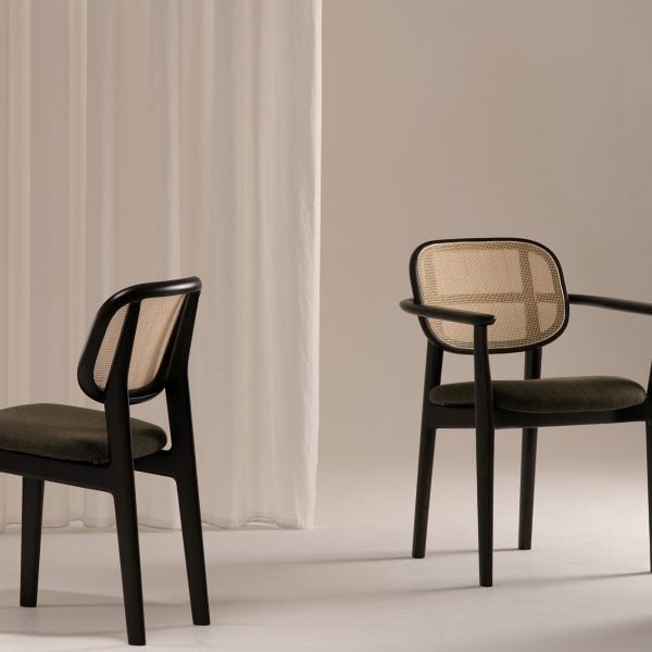 Lanzamiento en Clerkenwell Design Week 2024 Silla de comedor Baliken. La combinación de una estructura de madera maciza con un respaldo de ratán relaja las líneas rectas de la silla y le da un atractivo contemporáneo.