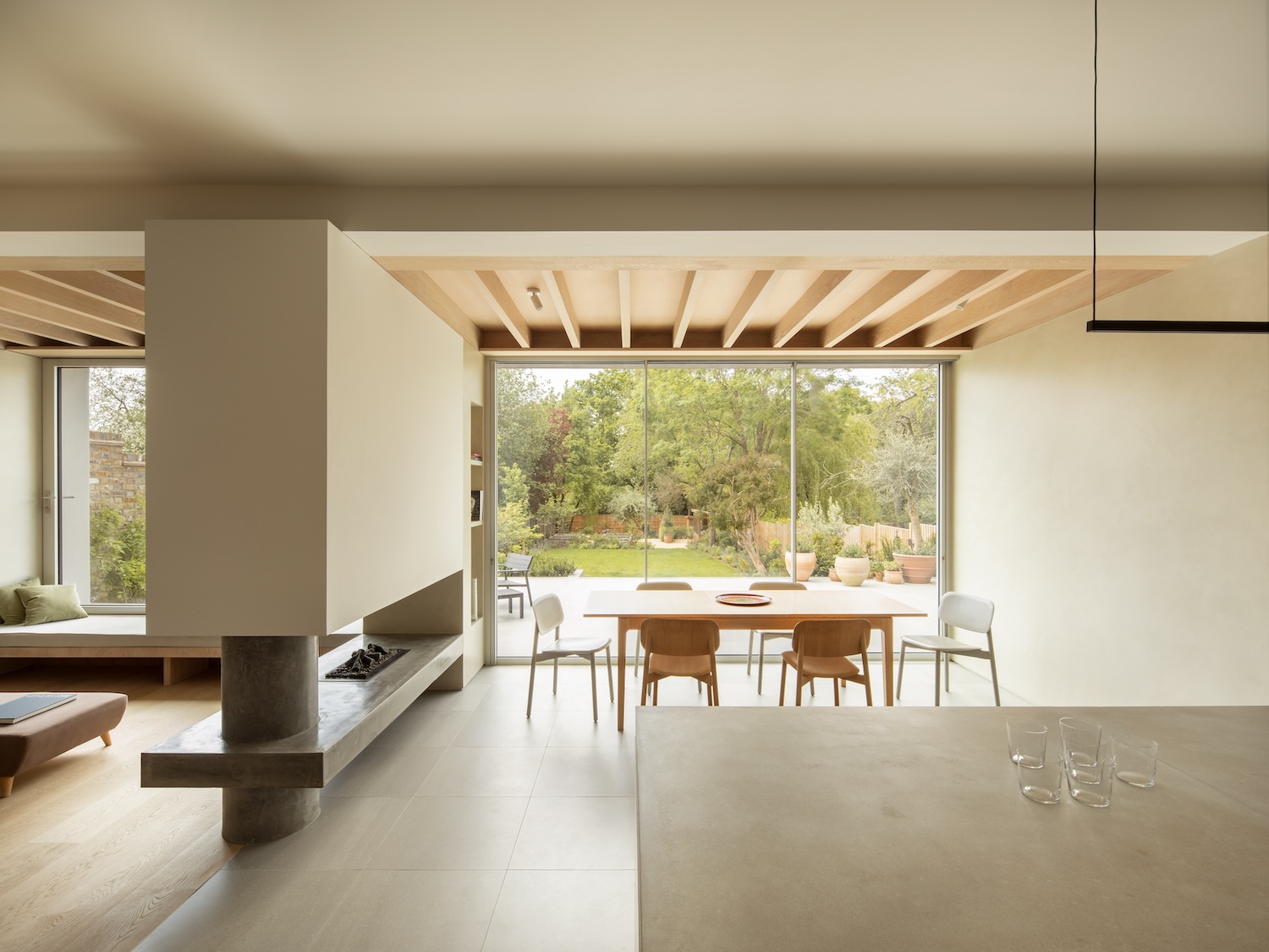 Las columnas presentan exposiciones profundas, rincones de almacenamiento y rincones suaves decorados con yeso de colores claros. Tres secciones acristaladas están empotradas en el dintel de arriba para proporcionar sombra, con sombra adicional proporcionada a través de posiciones de toldo discretamente incorporadas. Internamente, toda la casa ha sufrido distintos grados de renovación e intervención. La nueva cocina de roble diseñada por Proctor & Shaw se centra alrededor de una enorme isla de hormigón. Una puerta oculta sin marco conduce desde la cocina trasera al lavadero. Un nuevo corredor con paneles de color azul oscuro y una escalera de roble con balaustres curvos realzan el espacio del loft y añaden grandeza a la circulación central. Los cambios en los dormitorios fueron mínimos y el presupuesto se centró en un nuevo baño. La suite principal cuenta con un micro-top rosa y un doble lavabo de concreto rosa, que el cliente describe como «un lugar agradable para comenzar el día».