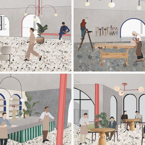 Visualización del concepto de centro comunitario en colores rosa, azul y verde.