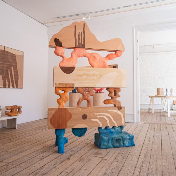una serie de exquisitos cuidadosamente elaborado Obra de arte, de colorido abstracto. escultura a la madera equipo y columpios, en exhibición en la feria de este año Jornadas de diseño del sur de Suecia.