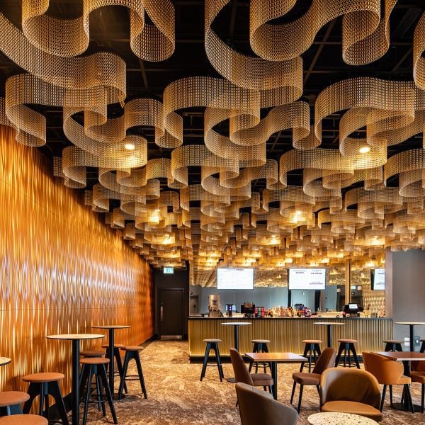 Instalaciones de techo de Kriskadecor Elaborado a partir de su característica cadena de aluminio, es un producto liviano disponible en diferentes colores, acabados y densidades.