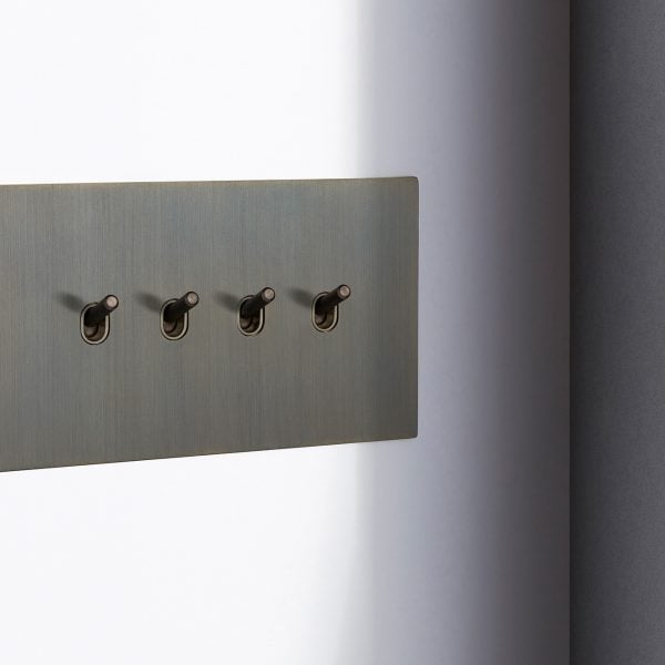 Sala de exposición Dezeen: Marca británica de hardware eléctrico. EnfoqueSB creó un minimalista accesorio hecho de sólido latón Se compone de paneles de esquina cuadrados sin tornillos visibles.