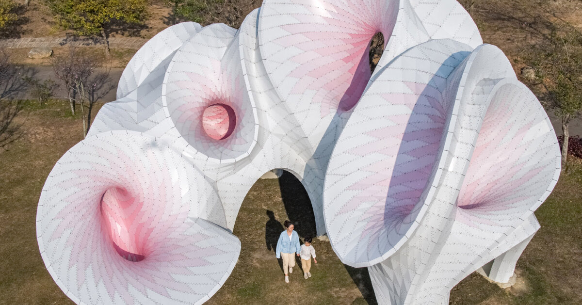 Su enorme volumen se eleva y gira, desplegándose como pétalos y creando varios bolsillos y aberturas en su interior para enmarcar las vistas de los cerezos en flor del jardín y el cielo azul. Ubicado en la intersección de instalaciones de arte escultórico y refugio arquitectónico, el pabellón brinda un respiro del clima cálido de Taiwán y promueve la exploración y la interacción social.