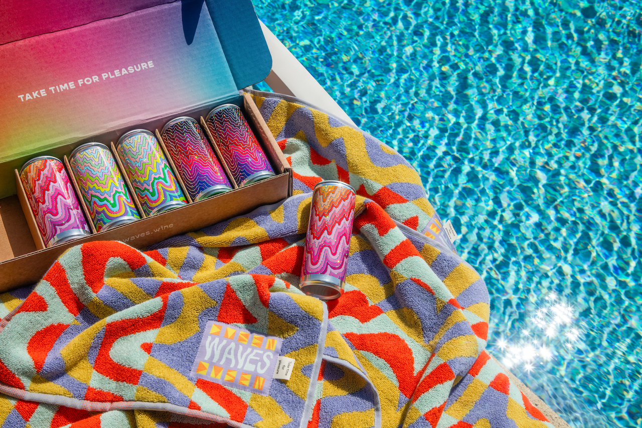 Justo a tiempo para el clima de verano, Vino Duson Duson x Olas La toalla de playa de felpa de la colaboración y el bolso de playa de felpa que la acompaña combinan las rayas de Van Dusen con las gotas de Stark. El nuevo patrón de goteo psicodélico es visualmente impactante y transmite una sensación de movimiento y profundidad. El exterior del bolso tiene un bolsillo del tamaño perfecto para guardar latas de vino Waves llenas de vino blanco, tinto o rosado.