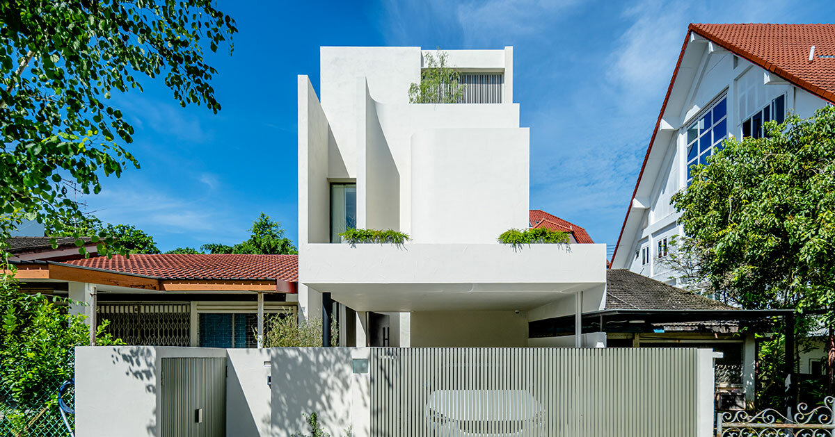 S+Arch Design y Q Architects colaboraron para diseñar Curlicue House en Sembawang Hill. Singapurcreando un todo Residencial Fluido y escultural frente. La fachada curva no sólo mejora la privacidad sino que también protege del calor la casa orientada al oeste. Detrás de él, ventanas de doble altura favorecen la ventilación e inundan el interior de luz natural. Para maximizar el espacio estrecho (menos de seis metros de ancho), los arquitectos alinearon estratégicamente todas las áreas de servicio y circulación vertical en un lado, dando como resultado un interior de doble volumen sin columnas. El interior crea una atmósfera luminosa y aireada con una paleta de materiales refinada que incluye yeso de cal, microcemento, roble, metal cepillado, granito martillado y granito pulido. mármol.
