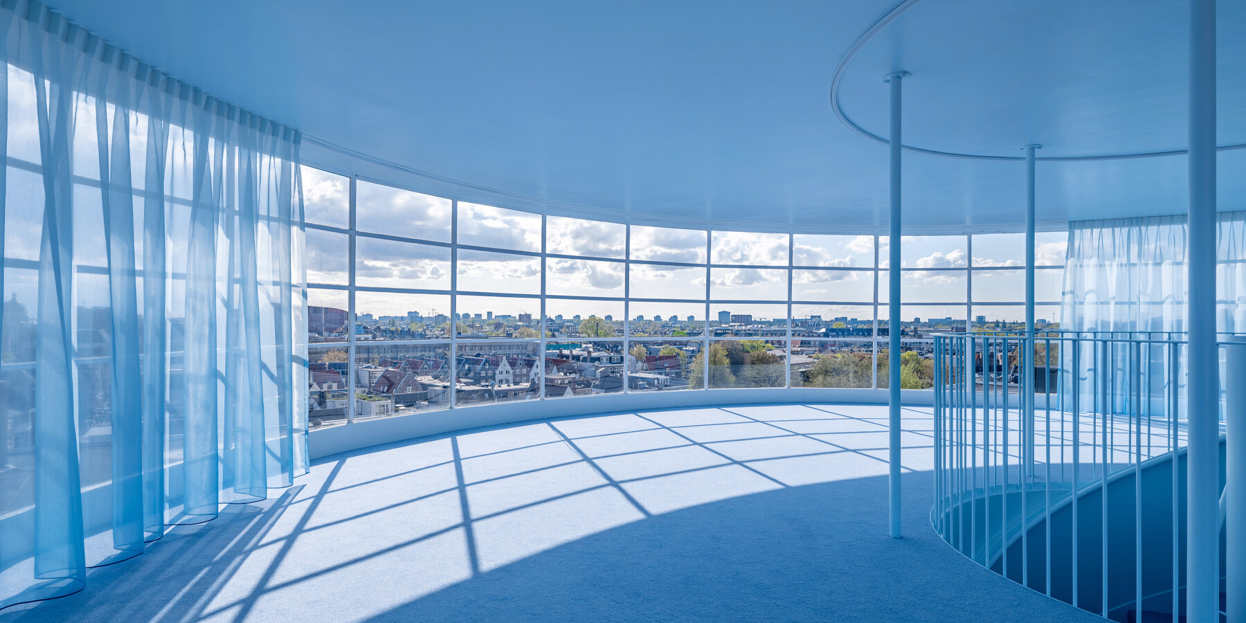 Este cambio vertical gradual culmina en los dos pisos superiores. Las paredes del sexto piso pasan del dorado al azul, lo que conduce a los pisos, acabados y techos azul cielo del Pabellón Rietveld. Aquí se ha conservado fielmente la esencia de esta historia modernista, con acabados refinados como alfombras y cortinas que lo convierten en un espacio exquisito para eventos como galas y desfiles de moda, tal como lo era hace casi 100 años. Las paredes de cristal de Rietveld ofrecen vistas panorámicas de los tejados de Ámsterdam, creando una sensación de amplitud y luz, y dando a los visitantes espacio para pensar en el futuro. NIO House Amsterdam es la tercera NIO House diseñada por MVRDV. También es la tienda insignia europea del fabricante de vehículos eléctricos y la NIO House más grande. Anteriormente, NIO House Chongqing abrió en 2019 y NIO House Rotterdam en 2023. Es la primera tienda de NIO en los Países Bajos.