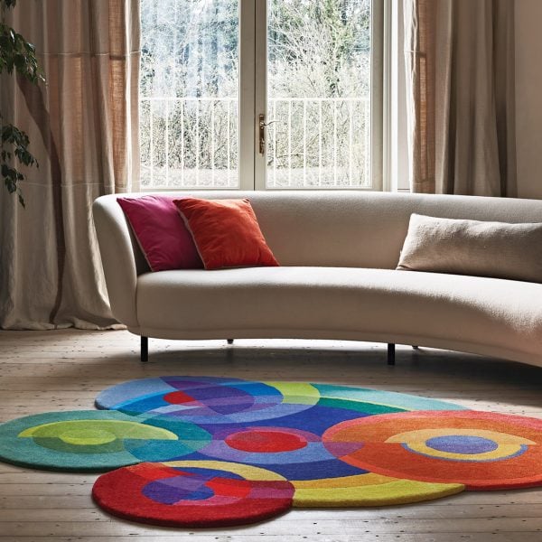 Las obras de arte caleidoscópicas de la fallecida artista francesa Sonia Delaunay fueron el principal punto de referencia detrás de la serie. Colección de alfombras Sonia y Sonya atravesar Estudio de alfombras Sonia Wenner.