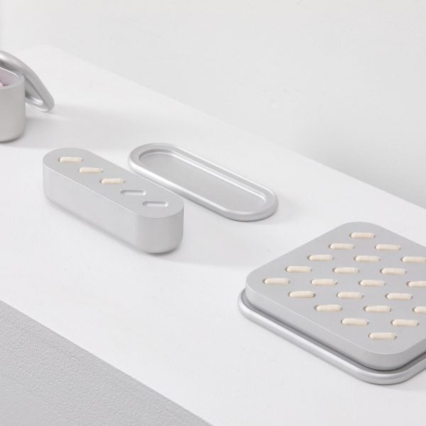 Pulseras en plata, teca y seda de Avantika Agarwal y una gama de aluminio Los pastilleros diseñados por Henry Julier representan las historias personales de los dos diseñadores.