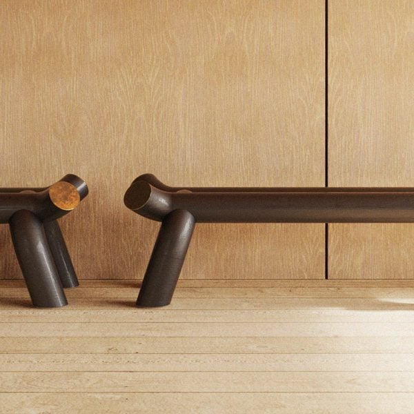 Un marco formado por tramos cilíndricos de madera terminados en discos planos de latón forma la marca del mueble. Estudios UltramarPresentado banco torii.