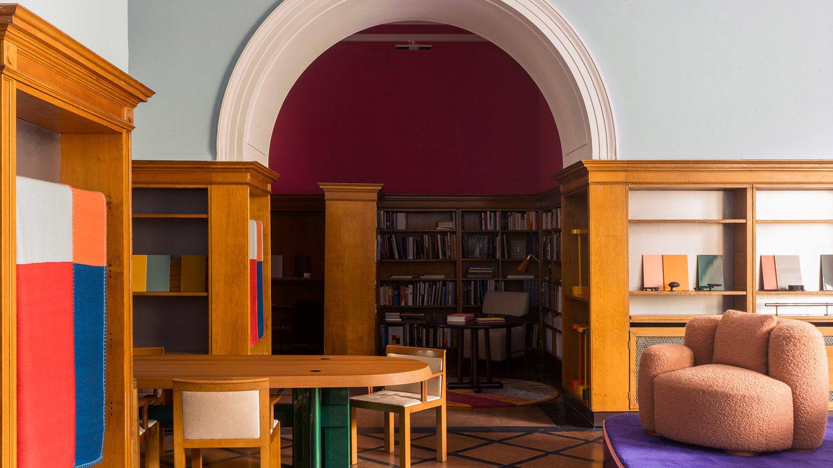 Las estanterías que originalmente albergaban libros ahora albergan muestras de materiales, paneles de imágenes y otra parafernalia relacionada con objetos.