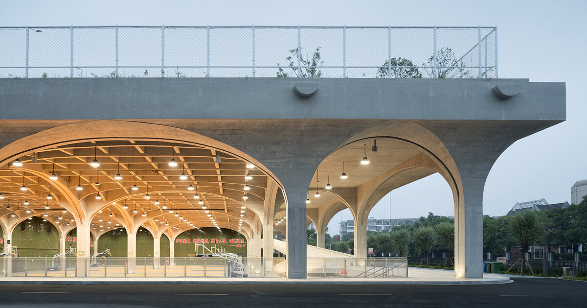 Una marquesina estructural abovedada perfila el campo deportivo cubierto de la Universidad de Shaoxing en China, diseñado por la UAD