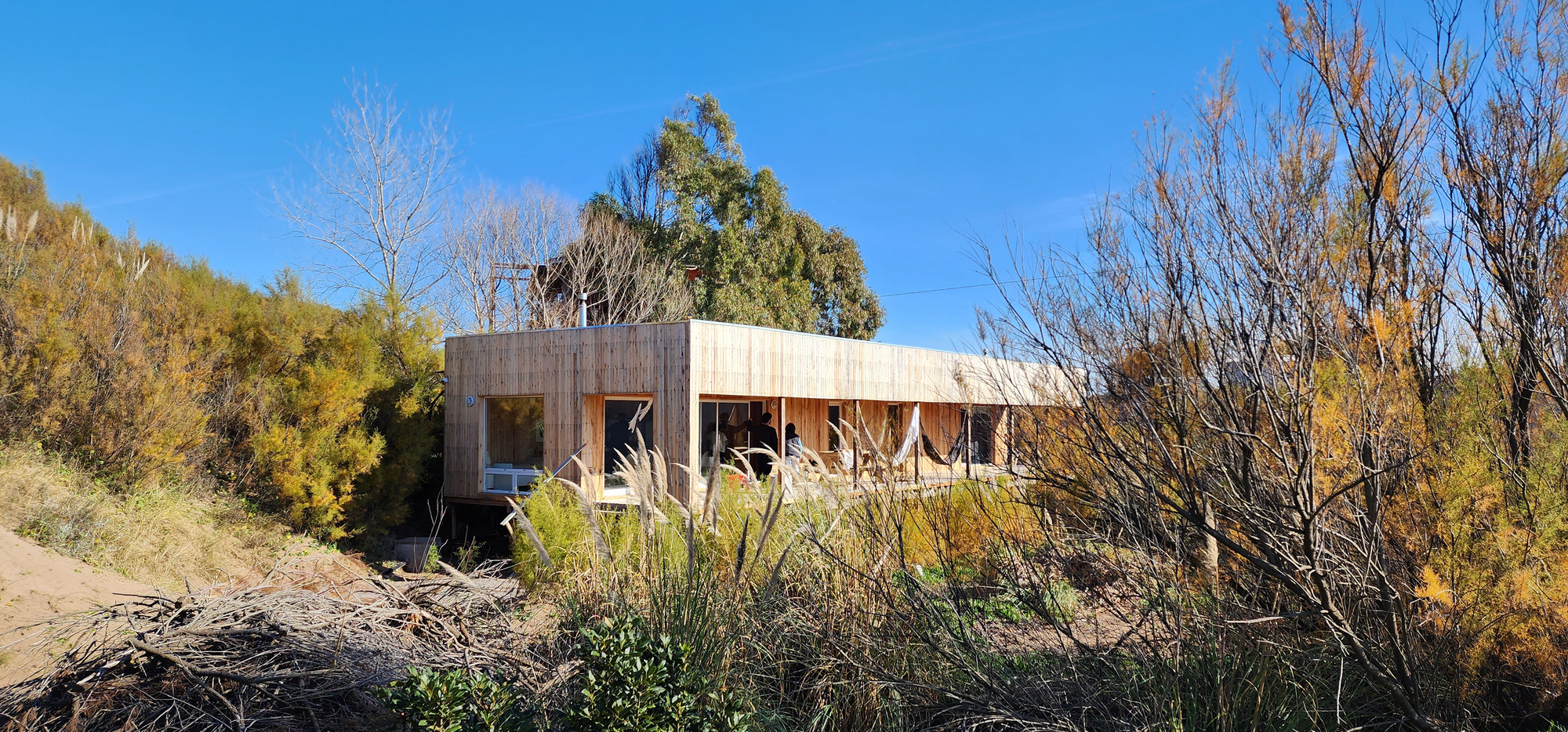 Descripción textual proporcionada por el arquitecto. Una casa de playa que una pareja y sus 3 hijos adolescentes comparten con amigos durante el verano. Balneario carta Es una zona costera separada del pueblo por dunas de arena, las cuales están fijadas por tamarisco, cotadela, pasto de pampa, uña de gato y algunas dunas no fijas que se desplazan de oeste a este por el viento. Estas dunas no paran de crecer en altura: como paisaje salvaje, duro, sin la intervención de la mano humana, se convierte en el potencial del terreno. Decidimos ubicar la casa en un lugar que preserva la naturaleza; la decisión de no cambiarla nos llevó a estudiar los huecos y las mejores vistas dentro de la parcela. Encontramos una zona del sitio alejada del único acceso, lo que permite tener las mejores vistas del lugar. Entre otras ventajas, la orientación del lugar lo protege de los fuertes vientos del suroeste, ya que el vecino plantó hace muchos años una zona boscosa. Estos vientos soplan desde el mar en invierno y otoño, trayendo tormentas de polvo desde el suroeste, lo que refuerza la necesidad de proteger los hogares.