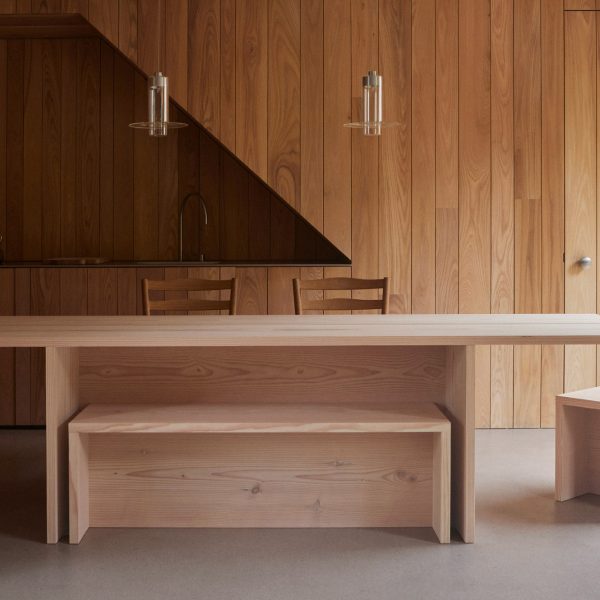 La colección también incluye taburetes cúbicos y bancos más largos hechos de una sola tabla de abeto Douglas con un lomo central. El banco está diseñado para colocarse debajo de la mesa del comedor.
