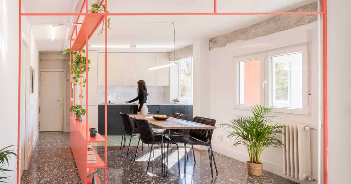 Una de las características principales del apartamento renovado es la inclusión de una estantería de metal pintada en un color brillante.