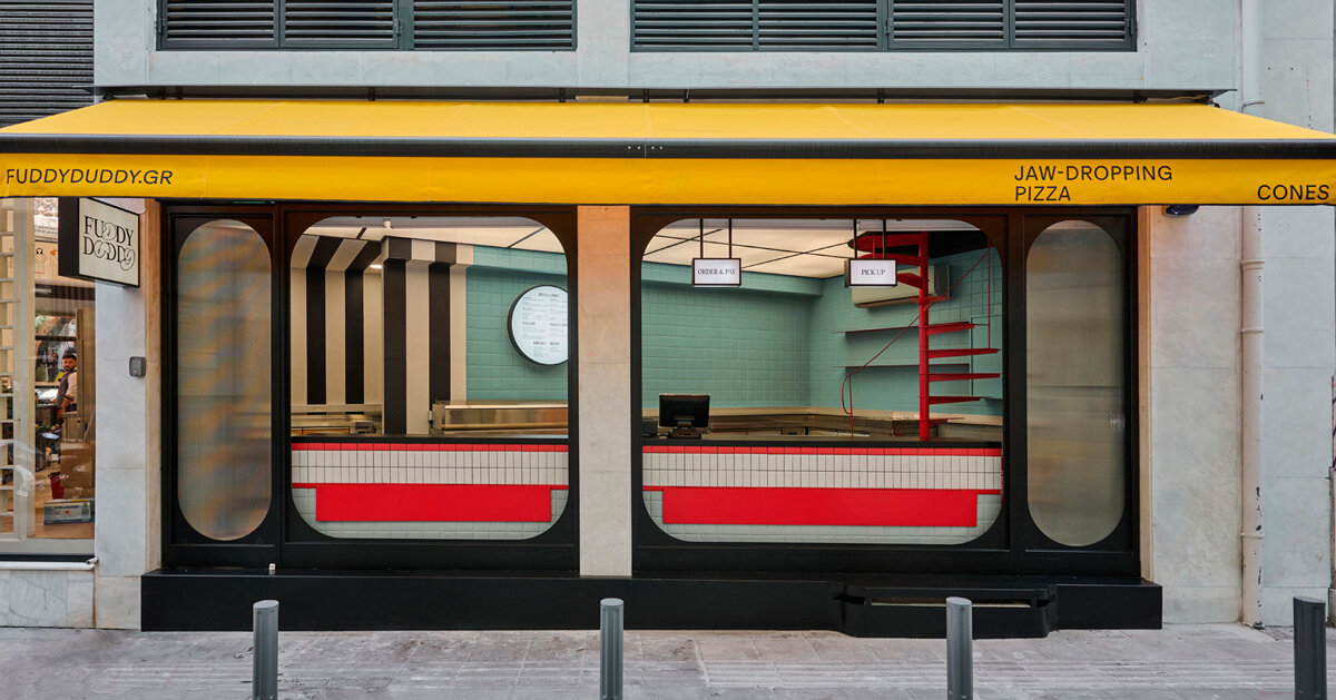 santo ateniense y los diseñadores de ICD lanzan FUDDY DUDDY, un exclusivo tienda de pizzas a domicilio Situado en el centro de Atenas, Grecia. La pequeña tienda reinventa la experiencia de la pizza callejera con sus innovadores tubos de pizza, diseñados para ser más grandes, más duros y más abundantes que las porciones de pizza tradicionales. El diseño de la tienda refleja un ambiente nostálgico y confortable, incorporando elementos de estilo retro para crear un ambiente cálido. De la tienda Interno Las formas geométricas simétricas recuerdan a los comensales americanos de los años 50. Combinaciones de colores atrevidos, líneas rectas y curvas pasadas de moda definen el espacio, logrando un equilibrio entre el diseño moderno y clásico. La inspiración visual proviene del universo de colores retro de Weiss Anderson y las líneas urbanas de las ventanas de Edward Hopper.