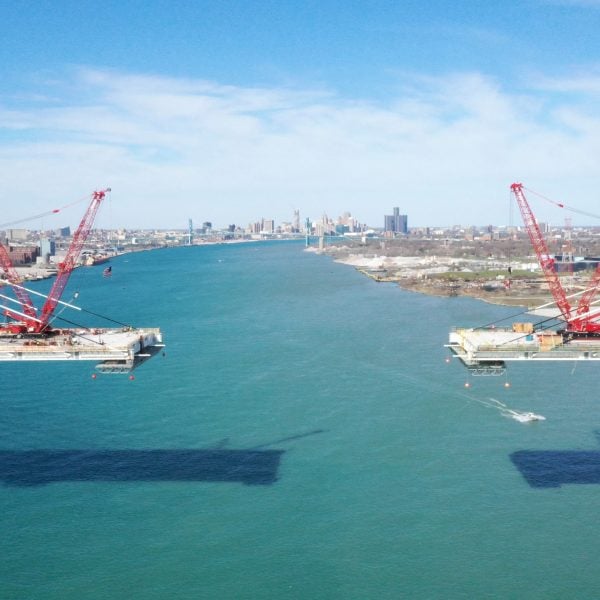 Quedan aproximadamente 85 pies (26 metros) de plataforma de puente sin construir entre los lados estadounidense y canadiense, y cada lado se extiende actualmente hasta el río Detroit.