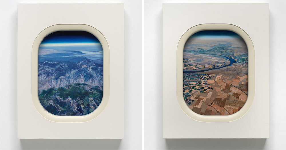 DB: En esta serie recreas vistas desde las ventanas de los aviones. ¿Qué te inspiró a componer estas pinturas de una manera tan específica?