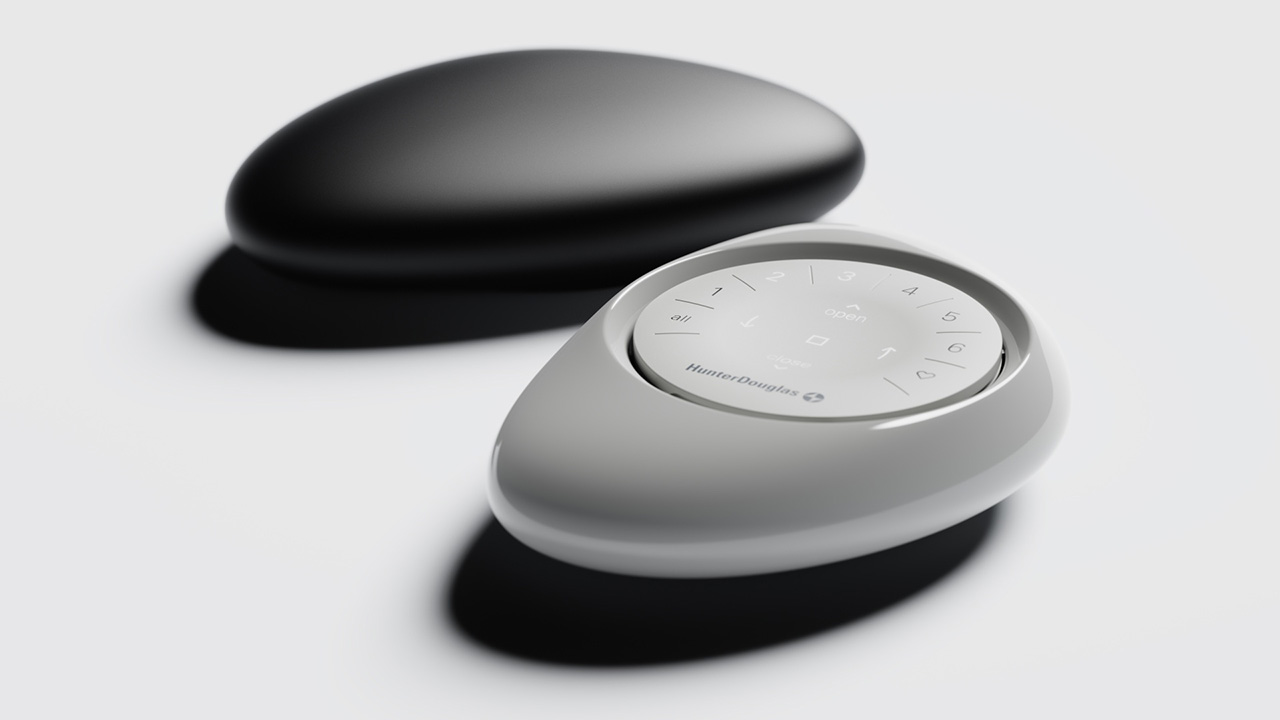 El diseño del control remoto Pebble se originó a partir de una piedra real extraída de la costa por un estudio de diseño industrial de San Francisco. corporación de diseño de roca. fundador, fred roca. Con la tarea de inyectar un cuidado ergonómico inusual como componente clave del sistema de cortina automatizado de Hunter Douglas, usaría la piedra para dar forma a los contornos del dispositivo portátil para que se sintiera instintivamente natural.