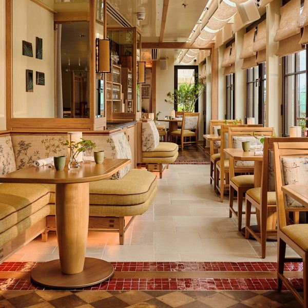 Se utilizan marcos de madera y «portales» con espejos cuadrados para definir el área del comedor principal, que incluye una banqueta en forma de L y sillas de comedor de roble tapizadas con bordados japoneses. seda.