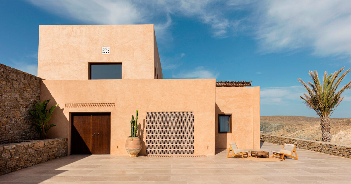 El piso superior alberga el dormitorio principal, la piscina, el bar al aire libre y la fogata. El nivel medio contiene dos dormitorios, una cocina, una sala de estar, una cocina al aire libre y un espacio para yoga. El nivel inferior alberga un dormitorio adicional y conduce a la piscina comunitaria rectangular y a la ducha exterior. Esta planta también incluye un cine, un bar y alojamiento para el personal de apoyo. El exterior de la villa adopta local. piedra Pintura lisa a base de cal, elegida por sus cualidades naturales y durabilidad en el clima mediterráneo. La entrada presenta un marco de puerta de acero corten cuyos tonos oxidados hacen eco del paisaje circundante. Se enfatiza un diseño abierto y aireado en toda la villa, con amplias terrazas al aire libre que se conectan perfectamente con los espacios interiores.