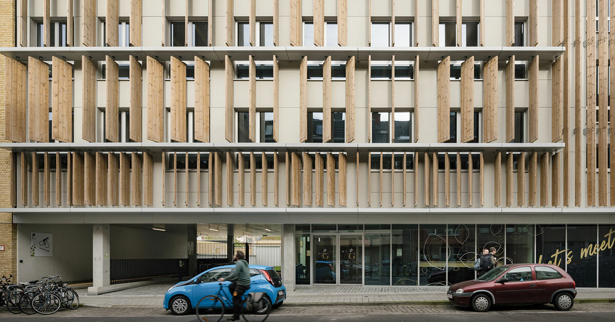Las lamas de madera, fabricadas con pino FSC termotratado, aportan ritmo al exterior del edificio
