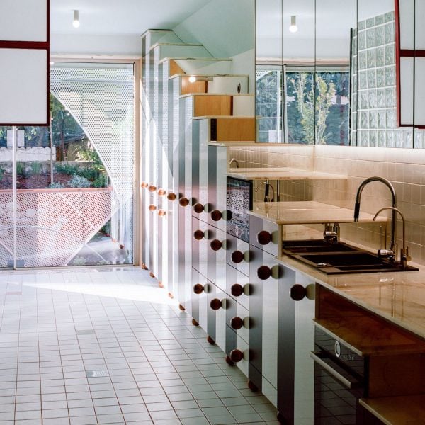 Arriba, una pared curva oculta la escalera y el baño del área de sala y cocina de planta abierta. Las puertas corredizas de vidrio al final de la cocina conducen a un balcón con escalones que conducen al jardín trasero.