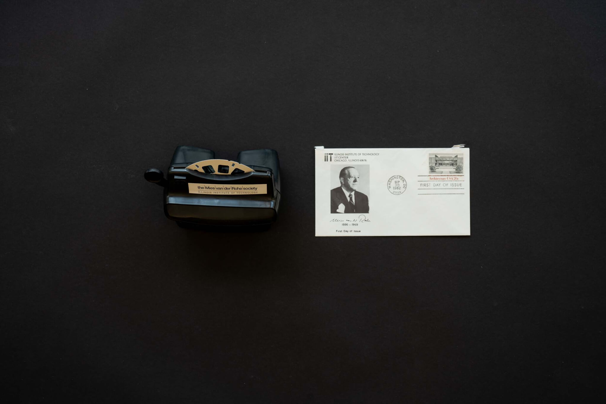 Inventado por un graduado negro de un Instituto Indio de Tecnología charles harrison, el primer View-Master acompañado de medios y efímeros, relata la vitalidad cultural del vecindario South Side Bronzeville donde se encuentra el IIT, un enclave cultural históricamente negro que fue ridiculizado como un gueto y en gran medida a expensas de la visión de Mies. Este maestro del espectáculo reconoce esta vitalidad descuidada y parece comprometido a observarla, tal vez haciéndola exótica, pero ofreciendo una forma alegre de verla. El segundo View-Master es un adorno conmemorativo que conmemora la restauración de 2005 del SR Crown Hall. Presentado con fragmentos Apartamento La Mecael desarrollo del IIT, la víctima de la construcción más famosa, y el desarrollo de Jurgen Joedicke historia de la arquitectura moderna Con SR Crown Hall en la portada, este View-Master ofrece una visión oscuramente normativa de Mies y el IIT, un mundo supuestamente más perfecto impuesto sobre el antiguo orden vertical;