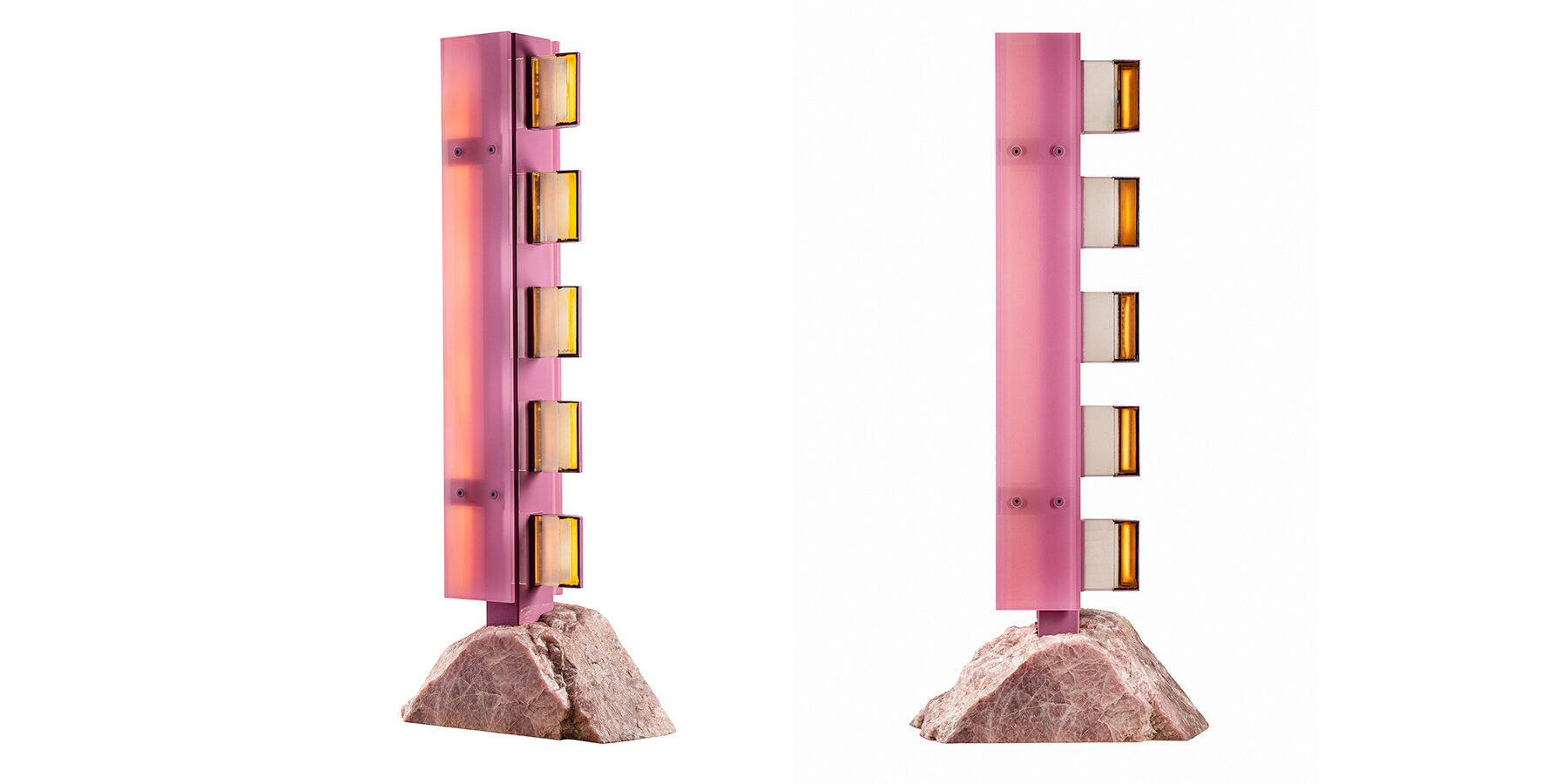 Nace como una idea de Enrico Marone Cinzano (ver más aquí) compró un gran trozo de ónix rosa sobrante de Italia. La roca translúcida formaba la base de una estructura de acero pintada a mano, rodeada por prismas de tanques reciclados de la Segunda Guerra Mundial e iluminada con luces LED. Lámparas para tanques de agua Rosa en exhibición en DiseñoMiami/Basilea El interés del artista por la naturaleza y el medio ambiente se explora a través de un diseño que combina tonos rosados con materiales industriales y un enfoque en materiales sostenibles y encontrados. Esta pieza única combina artesanía, una profunda conciencia y un enfoque ético para reutilizar materiales reciclados y proporciones inspiradas en la proporción áurea.