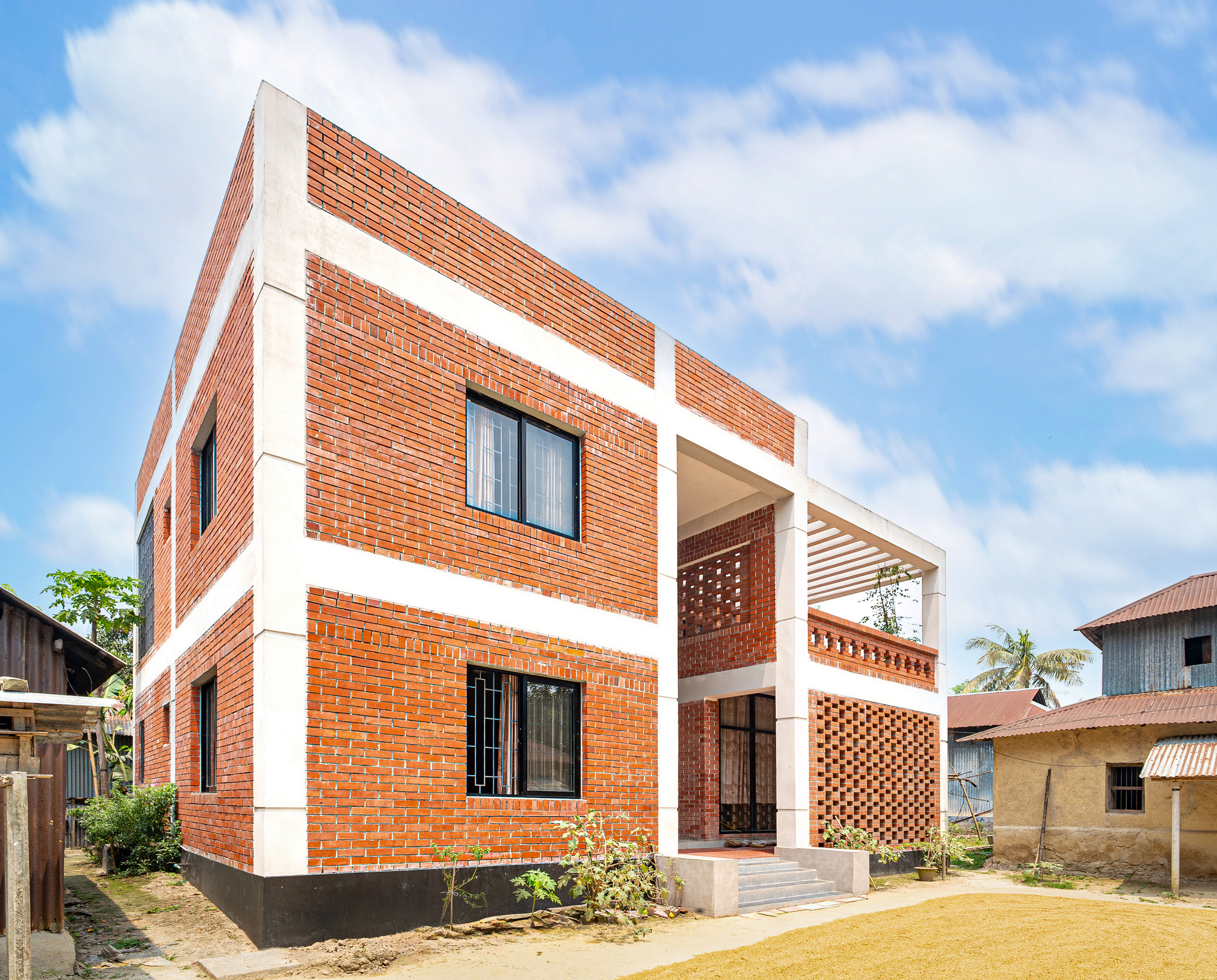 Descripción textual proporcionada por el arquitecto. Ubicado en el corazón del verde pueblo, Kabber Ghor es una maravilla arquitectónica de poca altura que combina a la perfección con el entorno natural que lo rodea y las estructuras de cobertizos de hojalata. Construida con ladrillos de origen local, esta encantadora casa prioriza la sostenibilidad y la armonía con el medio ambiente.