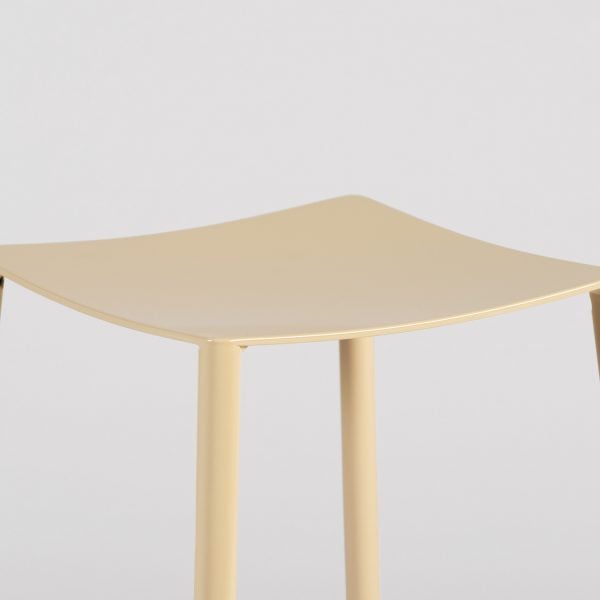 este taburete vivo Hay un asiento hecho de chapa de metal ligeramente cóncava que se asienta sobre cuatro delgadas patas cilíndricas.