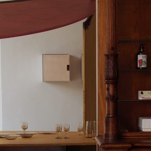 Su diseño final, hecho de madera contrachapada y pintado a mano en tonos cálidos, se instaló en cada habitación de la tienda Frama en una antigua farmacia de Copenhague.