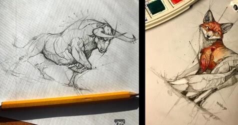 Dibujos a lápiz de animales y pinturas de acuarela.