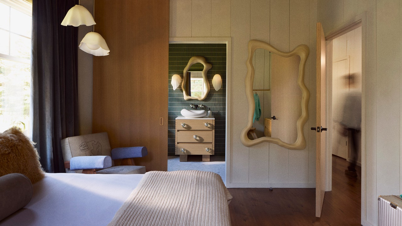Por supuesto, el baño es un gran foco, gracias a una instalación completa de la nueva gama de Arsham, terreno. Hay inodoros inteligentes Veil y productos WasteLAB fabricados con materiales reciclados, ambos inspirados en los fenómenos revelados por la erosión de la arena y los minerales; El fregadero tipo vasija ofrece una versión más rica del Rock.01, con un mango de grifo de vidrio inspirado en la forma de una gota de agua. Arriba cuelga un espejo, originalmente tallado y luego fundido por Arsham a partir de un bloque sólido de piedra. «Fue un juego con materiales», dice sobre la versión final de madera. Lo mismo ocurre con los bollos. «La luz parece casi como si pusieras un trozo de vidrio sobre una esfera y hubiera una tela corrugada sobre el vidrio».